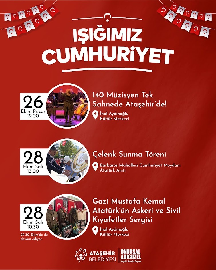 Cumhuriyet Bayramı etkinlikleri; Ataşehir Belediyesi Gençlik Senfoni Orkestrası, Yücel Elmas Korosu MÜZED ile Marmara Üniversitesi Çoksesli Korosu’nun sahne alacağı ve toplamda 140 müzisyenin aynı sahnede buluşacağı dev bir konserle 26 Ekim Pazar günü saat 19.00’da İnal Aydınoğlu Kültür Merkezi’nde başlayacak.