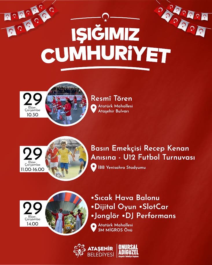 Ataşehir Belediyesi’nin 29 Ekim Cumhuriyet Bayramı’na özel olarak hazırladığı etkinlikler kapsamında; konser, balo, sergi, fener alayı yürüyüşü, futbol turnuvası, sıcak hava balon gösterisi ve Türkiye’nin en uzun koşu parkurunun lansmanı gerçekleştirilecek.