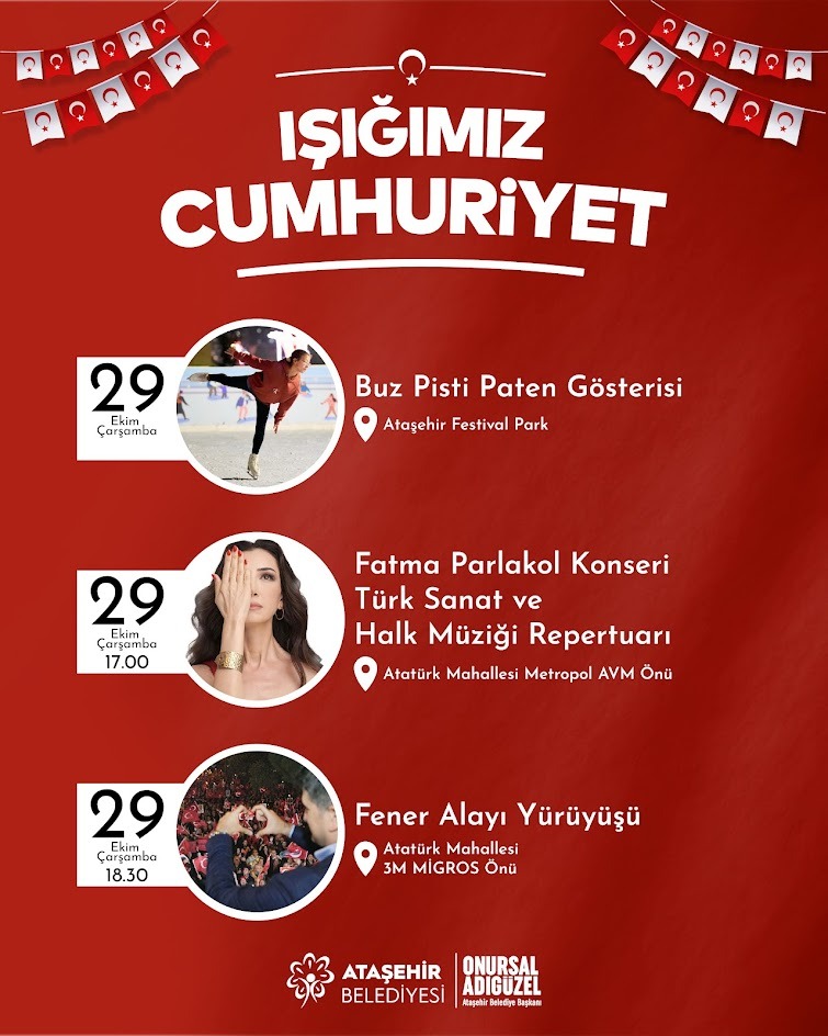 Ataşehirlilerin 29 Ekim’lerde geleneksel buluşma noktası olan Atatürk Mahallesi Ataşehir Bulvarı’nda (3M Migros Önü), fener alayı yürüyüşü öncesi saat 14.00’de; sıcak hava balonu spor aktivitesi, dijital oyun, pedallı araba yarışı (SlotCar), jonglör ve baston bacak gösterisi ile DJ performansı düzenlenecek. Ataşehir Festival Park’ta da “Buz Pisti Paten Gösterisi” yapılacak.