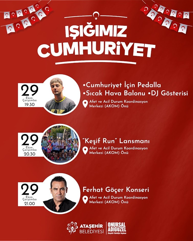 29 Ekim Cumhuriyet Bayramı, Ataşehir’de birçok etkinlikle kutlanacak. 26 - 27 - 28 - 29 ve 30 Ekim tarihlerinde Cumhuriyet Bayramı’na özel olarak hazırlanan etkinliklerle; müzik, spor, coşku, heyecan Ataşehir’de bir araya gelecek. Ferhat Göçer Konseriyle coşku doruğa ulaşacak.