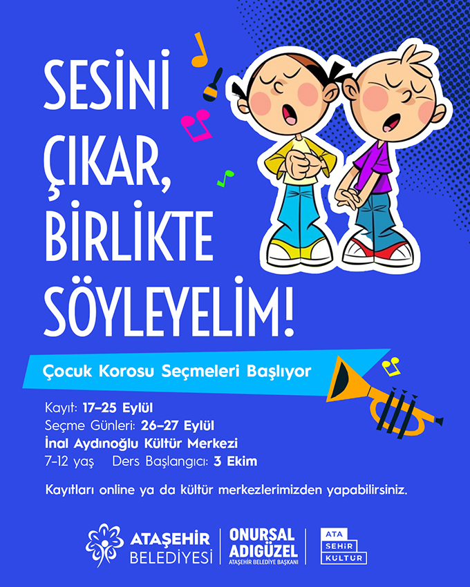 Sanata duyarlı nesiller yetiştirmek amacıyla kurulan Çocuk Korosu, çocuklara profesyonel sahne deneyimi kazandırarak müzik yoluyla kendilerini ifade etmelerine imkân tanırken, aynı zamanda onlara kolektif çalışma disiplini ve estetik bir müzik anlayışı kazandırmayı hedefliyor. Ulusal ve uluslararası festivallerde sahne alma fırsatı sunan, kapsamlı müzik eğitimiyle çocukların hem teorik hem de işitsel gelişimlerine katkı sağlayan koro, 7 - 12 yaş arası Ataşehirli tüm çocukları seçmelere davet ediyor. Seçmeler için başvurular; 17 – 25 Eylül tarihleri arasında gerçekleştirilirken, 26-27 Eylül’de yapılacak seçmelerde adayların müzikal ve işitsel yetenekleri değerlendirilecek. Dersler ise 3 Ekim’de başlayacak.