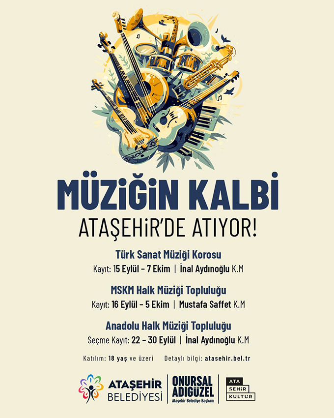 Ataşehir Belediyesi’nin sanat müziği ve halk müziği dallarında yetişkinlere yönelik kurduğu 3 farklı topluluk, her yıl yeni üyelerin katılımıyla gelişerek büyüyor. Bu kapsamda Ataşehir Belediyesi’nin; Türk Sanat Müziği, MSKM Halk Müziği ve Anadolu Halk Müziği toplulukları, yeni dönem çalışmalarına ekim ayında başlayacaklar.Müzik toplulukları sayesinde müzik zevklerini, bilgilerini ve repertuvarlarını geliştirecek katılımcılar, aynı zamanda yeni dostluklar da kuracaklar. Bünyelerine bu yıl da sanat müziği ve halk müziğine gönül veren yeni üyeler katmayı amaçlayan müzik toplulukları, bu müzik ailesinin parçası olmak isteyen Ataşehirli yeni sesleri bekliyor.Türk Sanat Müziği Korosu’na 15 Eylül – 7 Ekim, MSKM Halk Müziği Topluluğu’na 16 Eylül – 5 Ekim ve Anadolu Halk Müziği Topluluğu’na 22 – 30 Eylül tarihleri arasında başvuruda bulunulabilecek.