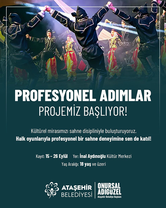 Ataşehir Belediyesi, kültürel mirasımız olan halk oyunlarını sahne disiplini ve profesyonel yaklaşımla buluşturmak amacıyla “Profesyonel Adımlar” projesinihayata geçiriyor. Bu projeyle kursiyerler yalnızca dans etmeyecek, aynı zamanda Anadolu’nun ritmini sahneye taşıyarak kültürel değerlerimizi gelecek nesillere aktaracak. Proje sayesinde, katılımcılar hem profesyonel bir sahne deneyimi yaşayacak hem de yeteneklerini sergilemek ve geliştirmek için fırsat yakalayacaklar. 18 yaş ve üzeriAtaşehirlilerin katılabileceği Profesyonel Adımlar projesine başvurular, 15 – 26 Eylül tarihleri arasında yapılırken, seçme sınavı 28 Eylül’de gerçekleştirilecek.