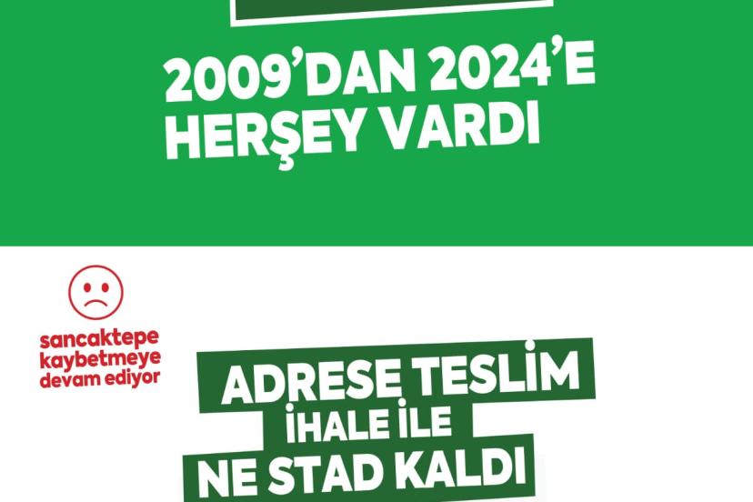 1. Spor ve Stadyum İhtiyacı Sancaktepe’nin spora ve stadyuma ihtiyacı vardı. 2009’dan 2024’e her şey vardı. Sancaktepe kaybetmeye devam ediyor. Adrese teslim ihale ile ne stad kaldı ne de sporcu.