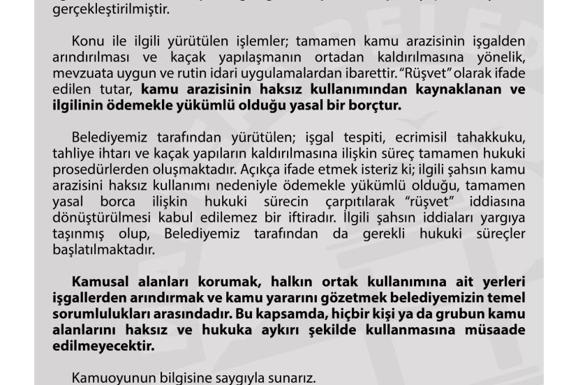 Belediye tarafından yürütülen; işgal tespiti, ecrimisil tahakkuku, tahliye ihtarı ve kaçak yapıların kaldırılmasına ilişkin süreç tamamen hukuki prosedürlerden oluştuğuna vurgu yapılırken; ilgili şahsın kamu arazisini haksız kullanımı nedeniyle ödemekle yükümlü olduğu, tamamen yasal borca ilişkin hukuki sürecin çarpıtılarak ‘rüşvet’ iddiasına dönüştürülmesinin kabul edilemez olduğu belirtildi.