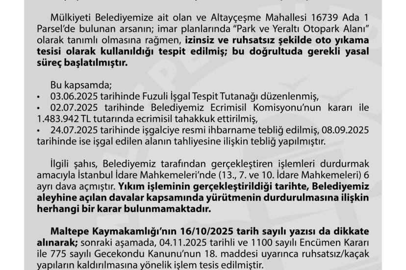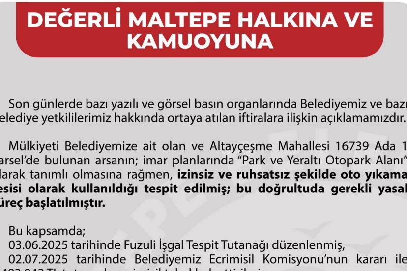 Maltepe Belediyesi, son günlerde bazı yazılı ve görsel basın organlarında, kurum ve bazı kurum yetkilileri hakkında ortaya atılan iddialarla ilgili açıklama yaptı. Mülkiyeti belediyeye ait olan Altayçeşme Mahallesi’nde bulunan (16739/1) arsaya ilişkin yapılan açıklamada arsanın imar planlarında “Park ve Yeraltı Otopark Alanı” olarak tanımlı olmasına rağmen, izinsiz ve ruhsatsız şekilde oto yıkama tesisi olarak kullanıldığının tespit edildiği belirtildi.