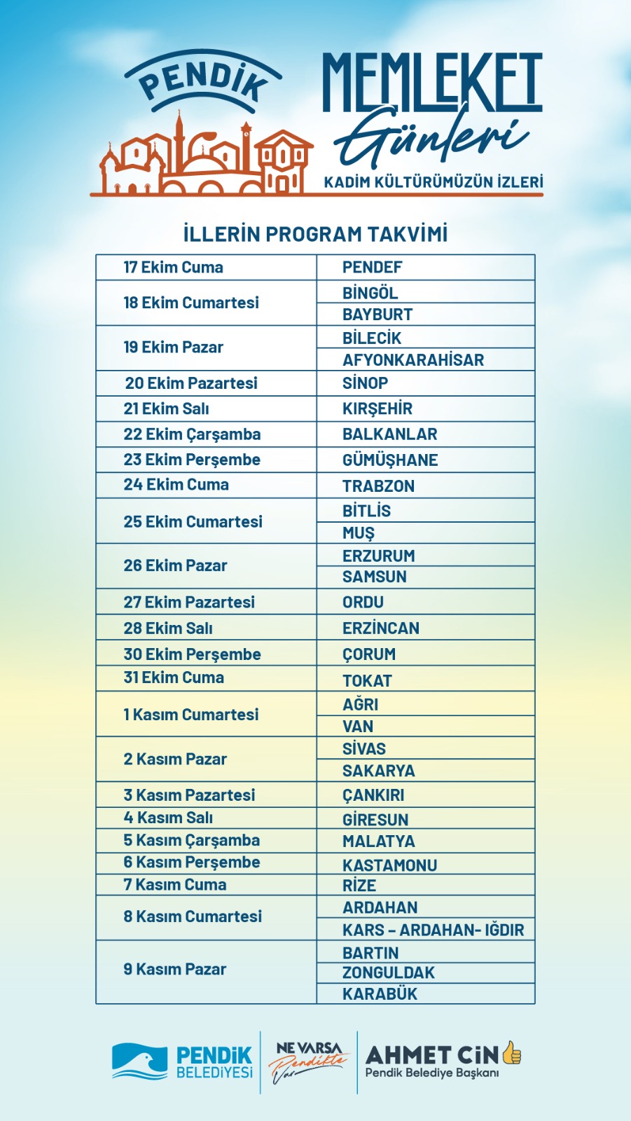 Pendik Belediyesi, kültürel zenginliklerimizi tanıtmak ve hemşehrilerimizi bir araya getirmek amacıyla Pendik Millet Bahçesi’nde “Pendik Memleket Günleri, Kadim Kültürümüzün İzinde” Programını düzenliyor. Etkinliğin açılışı Cuma günü Saat: 15.00’te gerçekleştirilecek. Daha önce Pendik Sahil Meydanı’nda düzenlenmesi planlanan etkinlik, İBB’nin gerekçe göstermeden alan kullanımına izin vermemesi nedeniyle iptal edilmişti.