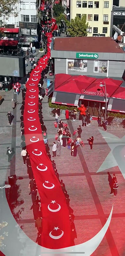 Kutlamalar, Pendik Belediyesi’nin organize ettiği kortej yürüyüşüyle devam etti. 102 metrelik dev Türk bayrağı Pendik çarşısında taşındı.