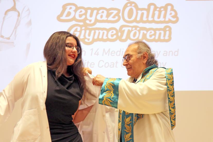 Konuşmaların ardından törenin en çok beklenen duygu dolu anlarına geçildi. Tıp Fakültesi Türkçe ve İngilizce bölümü 1. sınıf öğrencileri, gruplar halinde alkışlar eşliğinde sahneye davet edildi.Üniversitenin saygıdeğer akademisyenleri ve hocalarının ellerinden beyaz önlüklerini giyen öğrenciler, kutsal hekimlik mesleğine resmi olarak ilk adımlarını atmış oldular. 2025-2026 Akademik Yılı 14 Mart Tıp Bayramı ve Beyaz Önlük Giyme Töreni, hocalar ve önlüklerini giyen öğrencilerin sahnede bir araya gelerek günün anısına dev bir aile fotoğrafı çektirmesiyle coşku içinde sona erdi.